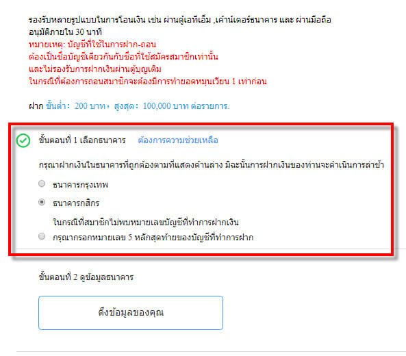 2.คลิกเลือกธนาคาร  > ดึงข้อมูลเพื่อดูเลขที่ธนาคารของ Fun88