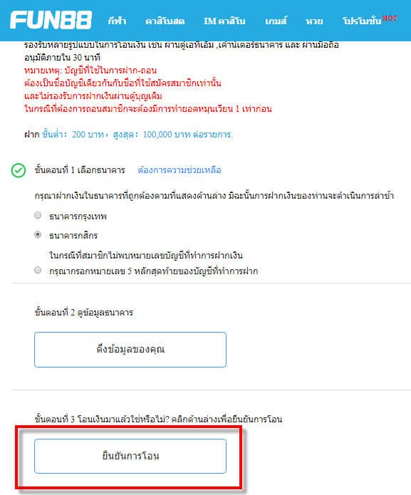 วิธีแจ้งการฝากเงิน เข้า FUN88