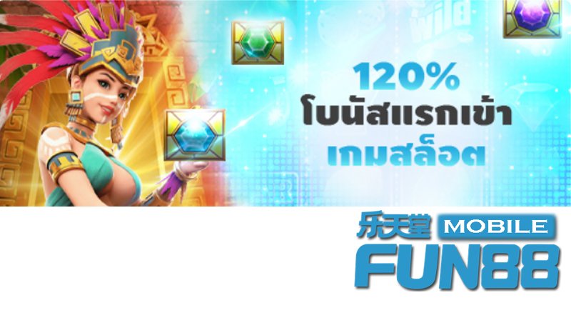 โบนัสแรกเข้าที่เกมส์สล็อต 120% รับโบนัส 120% สำหรับการฝากเงินครั้งแรก เมื่อคุณเข้าร่วมสนุกกับ FUN88!